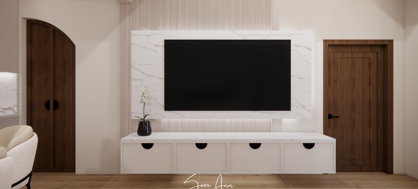 Designed for a couple who wanted their home to feel open, calm, and effortlessly connected, this project focused on creating a seamless open-plan living, kitchen, and dining space. The design palette draws from warm neutrals, soft taupes, and natural wood tones to establish a timeless and inviting atmosphere. We paired calacatta gold marble surfaces, matte cabinetry, fluted wood detailing, and warm walnut joinery to add depth and texture while maintaining visual harmony. The moodboard centered on soft minimalism with layered natural materials, allowing light, clean lines, and subtle contrasts to define the space. The result is a balanced environment that feels both refined and comfortable—perfect for everyday living and entertaining.